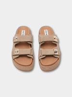 Perfect for lounging and athleisure looks, the SCHMONA sandal features a wide flat sole and a molded footbed for extra comfort. This classic double strap slide design gets an elevated look with a quilted finish and faux turn lock hardware on the adjustable straps.