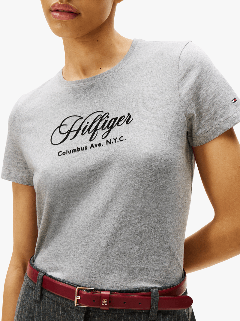 Get your hands on the ultra-comfortable Tommy Hilfiger Grey Script Reg Crewneck T-Shirt. Made of soft cotton, this top features the iconic logo script for a touch of style. Stay comfortable and trendy all day long in this must-have tee.