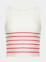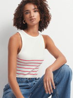 This racer vest is everything we are loving for the upcoming season. Featuring a white and red stripe seamless fabric. Style with a cute skirt or jeans and sneakers for a fresh finish.