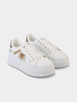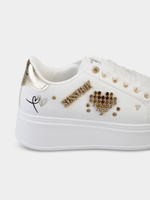 These white platform trainers feature a playful heart gem detail. Combining height with comfort and a touch of sparkle, they are a fun and trendy addition to your footwear collection.