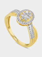 Expertly crafted in 9ct Yellow Gold, this beautiful ring features an oval cluster of round-cut Earth Grown Diamonds in a halo setting and an elegantly twisted band glittering with pavé set stones. The total Diamond weight is 0.25 carats.