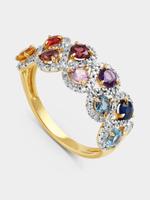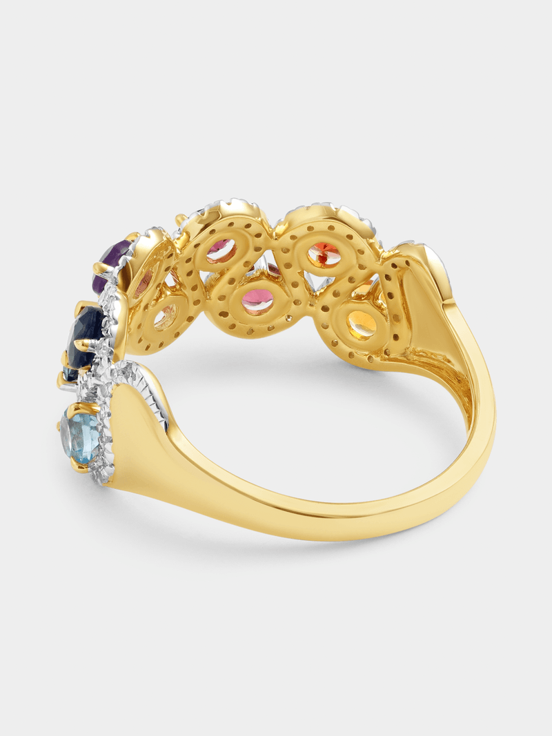 Expertly crafted in 9ct Yellow Gold, this beautiful ring features round-cut multicoloured natural gemstones embraced by halos of pavé set Earth Grown Diamonds. The total Diamond weight is 0.25 carats.