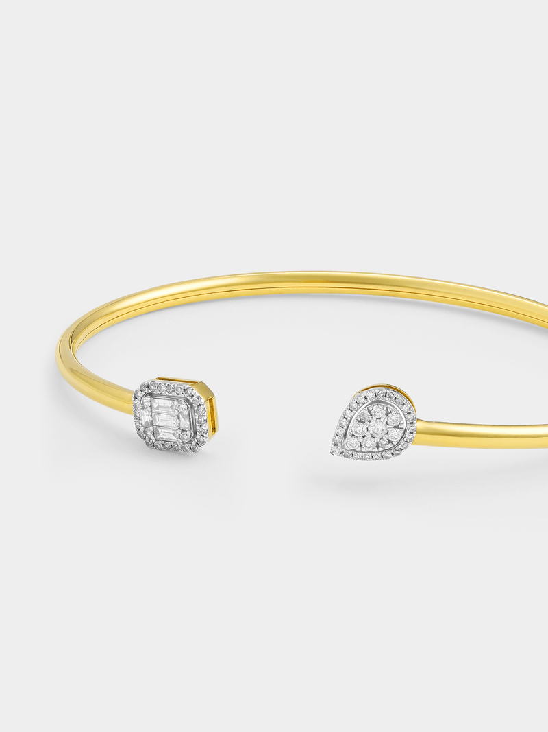 Expertly crafted in 9ct Yellow Gold, this beautiful 60mm cuff bangle features a cushion and pear design glittering with pavé set Earth Grown Diamonds. The total Diamond weight is 0.50 carats.
