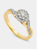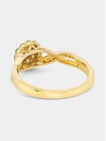 Expertly crafted in 5ct Yellow Gold, this beautiful ring features a round-cluster of pavé set Created White Sapphires in a halo setting and an intricately beaded woven band enhanced by accent Diamonds.