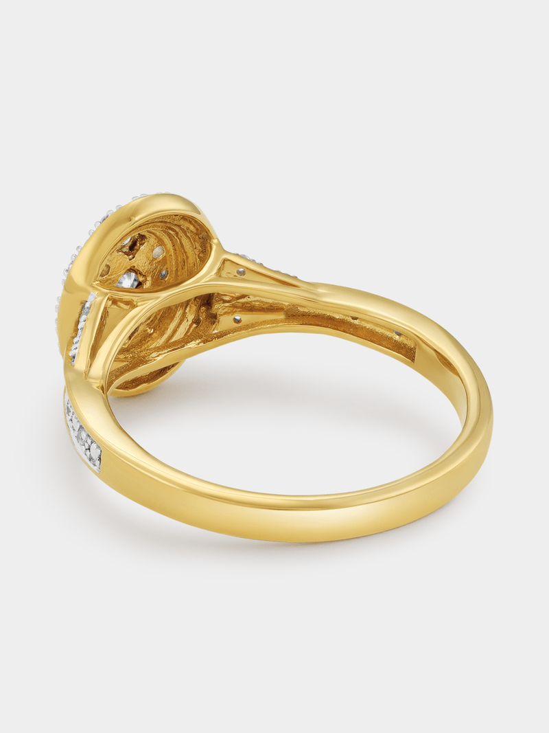 Expertly crafted in 9ct Yellow Gold, this beautiful ring features an oval cluster of full-cut Earth Grown Diamonds in a halo setting and a split-shank band glittering with pavé set stones. The total Diamond weight is 0.18 carats.