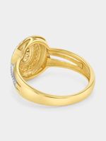Expertly crafted in 5ct Yellow Gold, this opulent ring features an oval cluster of round-cut Created White Sapphires and an 8/8-cut Earth Grown Diamond in a double halo setting and a split-shank band enhanced by intricate beading.