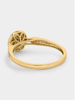 Expertly crafted in 9ct Yellow Gold, this beautiful ring features a round cluster of round-cut Diamonds in an illusion setting embraced by a halo of yet more stones that also glitter on the band’s shoulders.