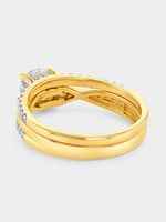 Expertly crafted in 9ct Yellow Gold, this magnificent twinset set ring features a round-cut Moissanite solitaire and elegantly twisted bands glittering with pavé set stones. Created Blue Sapphires set in a flame-shaped embrace enhances the ring’s gallery, symbolising eternal love, truth and faithfulness.