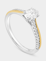 Expertly crafted in 9ct Yellow Gold and Sterling Silver, this beautiful ring features an oval-cut Lab Grown Diamond solitaire and an elegantly twisted band glittering with pavé set stones. The total Diamond weight is 0.63 carats.