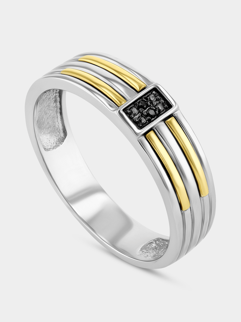 Expertly crafted in 5ct Yellow Gold and Sterling Silver, this stylish two-tone ring features an intricately beaded rectangle design enhanced by pavé set Black Diamonds.