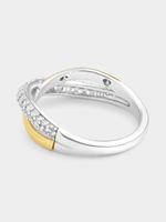 Expertly crafted in 9ct Yellow Gold and Sterling Silver bonded together, this beautiful two-tone cross over ring features a split-shank band glittering with pavé set Cubic Zirconia.