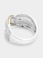 Expertly crafted in 9ct Yellow Gold and Sterling Silver bonded together, this beautiful two-tone cross over ring features a split-shank band glittering with pavé set Cubic Zirconia.