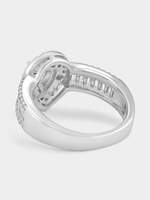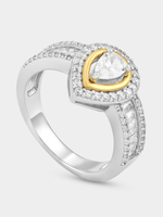 Expertly crafted in 9ct Yellow Gold and Sterling Silver bonded together, this beautiful ring features a pear-cut Cubic Zirconia embraced by a halo of round-cut stones and a band glittering with baguette-cut and round-cut stones.