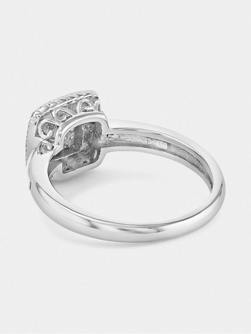 Expertly crafted in 5ct Yellow Gold and Sterling Silver, this bold ring features a cushion-shaped cluster of pavé set Created White Sapphires and Diamonds in a halo setting.
