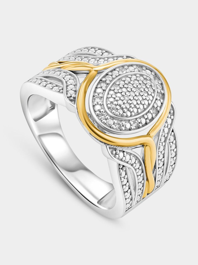 Expertly crafted in 5ct Yellow Gold and Sterling Silver, this ring features an oval cluster of Earth Grown Diamonds and Created White Sapphires including in a halo setting and an elegantly twisted band enhanced by intricate beading.