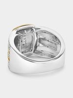 Expertly crafted in 5ct Yellow Gold and Sterling Silver, this beautiful ring features a rectangle cluster of Earth Grown Diamonds and Created White Sapphires including an a halo setting and a split-shank band enhanced by intricate beading.