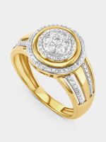 Expertly crafted in 5ct Yellow Gold and Sterling Silver, this beautiful ring features a round cluster of round-cut Created White Sapphires including an Earth Grown Diamond in a double halo setting and a broad band enhanced by intricate beading.