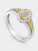 Expertly crafted in 9ct Yellow Gold and Sterling Silver, this beautiful ring features an oval cluster of round-cut Lab Grown Diamonds in a halo setting and an intricately beaded split-shank band. The total Diamond weight is 0.06 carats.