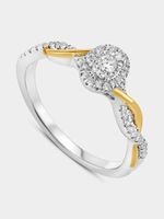 Expertly crafted in 9ct Yellow Gold and Sterling Silver, this beautiful ring features a round-cut Lab Grown Diamonds embraced by an oval-shaped halo of pavé set stones that sparkle on the elegantly twisted band.