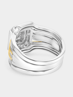 Expertly crafted in 9ct Yellow Gold and Sterling Silver, this bold triple set ring features a rectangle cluster of single-cut Lab Grown Diamonds in a halo setting and bands enhanced by intricate beading.