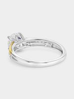 Expertly crafted in 9ct Yellow Gold and Sterling Silver, this radiant set ring features a round-cut Moissanite solitaire and a double band glittering with pavé set stones. A pair of Created Blue Sapphires set in a flame-shaped embrace enhances the ring’s gallery, symbolising eternal love, truth and faithfulness.