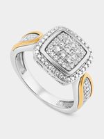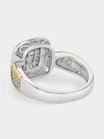 Expertly crafted in 5ct Yellow Gold and Sterling Silver, this radiant ring features a cushion-shaped cluster of round-cut Earth Grown Diamond accents and Created White Sapphires in a halo setting and a band enhanced by intricate beading.