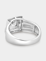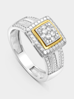 Expertly crafted in 5ct Yellow Gold and Sterling Silver, this beautiful two-tone ring features a cushion-shaped cluster of pavé set Created White Sapphires with an Earth Grown Diamond accent in a halo setting and an intricately beaded split-shank band. The total Diamond weight is 0.003 carats.