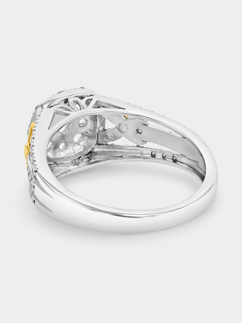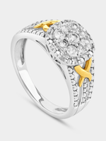 Expertly crafted in 9ct Yellow Gold and Sterling Silver, this romantic ring features a cushion-shaped cluster of round-cut Created White Sapphires in a halo setting that includes Earth Grown Diamond accents and an intricately beaded kiss cross band. The total Diamond weight is 0.007 carats.