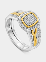 Expertly crafted in 5ct Yellow Gold and Sterling Silver, this beautiful two-tone twinset ring features a Rec cluster of pavé set Created White Sapphires with Earth Grown Diamond accents in a halo setting and intricately beaded split-shank bands. The total Diamond weight is 0.0019 carats.