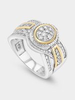 Expertly crafted in 5ct Yellow Gold and Sterling Silver, this opulent ring features an oval cluster of round-cut Created White Sapphires in a halo setting and a wrap over-style band glittering with pavé set stones including an Earth Grown Diamond accent.