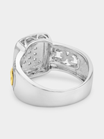 Expertly crafted in 5ct Yellow Gold and Sterling Silver, this bold ring features a rectangle cluster of round-cut Created White Sapphires including Lab Grown Diamond accents in a halo setting and a chain link-inspired band enhanced by intricate beading.