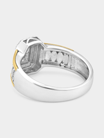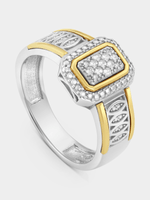 Expertly crafted in 5ct Yellow Gold and Sterling Silver, this beautiful two-tone ring features a rectangle cluster of pavé set Created White Sapphires with an Earth Grown Diamond accent in a halo setting and mini marquise-inspired band. The total Diamond weight is 0.003 carats.