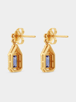 Expertly crafted in 18ct Gold Vermeil, these beautiful drop earrings feature emerald-cut blue Cubic Zirconia embraced by halos of white stones in assorted cuts adorned by round-cut stones in bezel settings.