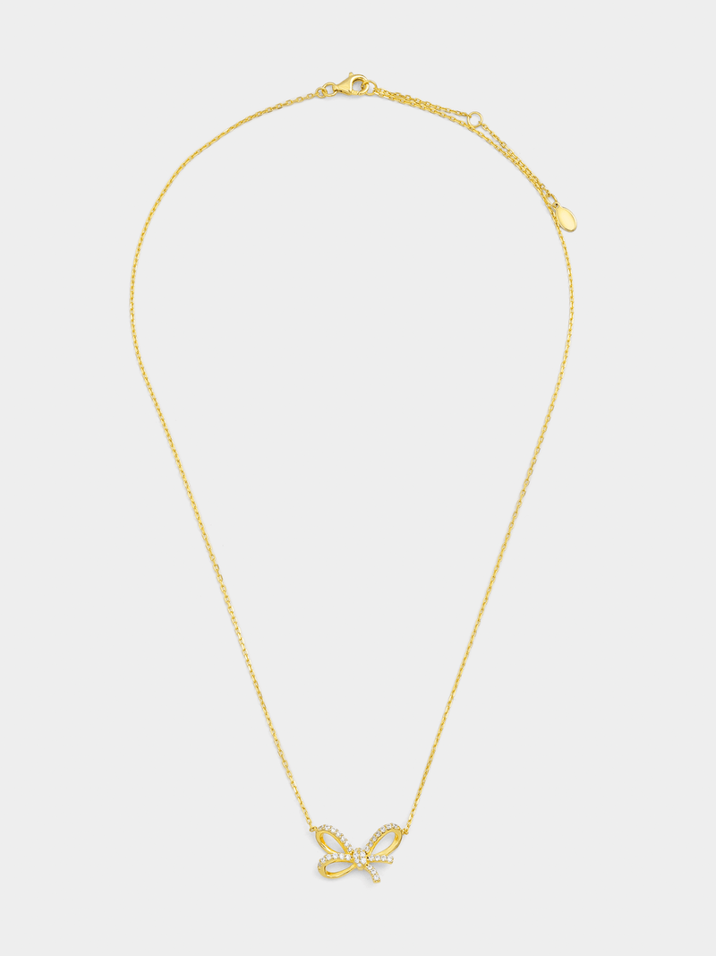 Expertly crafted in 18ct Gold Vermeil, this fancy bow necklet glitters with pavé set Cubic Zirconia.