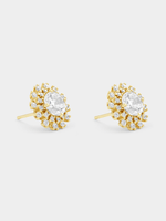 Expertly crafted in 18ct Yellow Gold Vermeil, these beautiful stud earrings feature round-cut Cubic Zirconia embraced by a sunray-inspired halos.