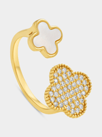 Expertly crafted in 18ct Gold Vermeil, this beautiful clover bend up ring is inlaid with Mother Of Pearl and glitters with pavé set Cubic Zirconia.