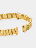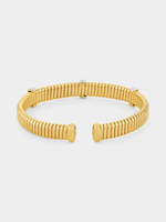 A bold ribbed cuff expertly crafted in 18ct Gold Vermeil.Gold Vermeil is Sterling Silver plated with a luxurious layer of 18ct Yellow Gold. The thickness of the 18ct Gold plating is at least 2.5 microns for extended durability. The cuff contains an inner stainless steel plate ensuring strength and tension.