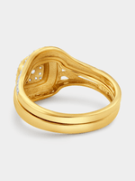 Expertly crafted in 5ct Yellow Gold, this beautiful twinset ring features a cushion-shaped cluster of round-cut Created White Sapphires in a halo setting that includes an Earth Grown Diamond accent and curved, eyelet-inspired bands enhanced by intricate beading. The total Diamond weight is 0.003 carats.