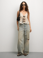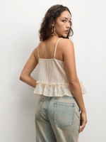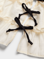 Elevate your outfit with our white strappy front tie ruffle top. Made from yoryu fabric, this top features a V-neckline and is perfect for any occasion. Embrace style and comfort with this versatile piece.
