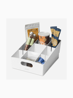 Organize your pantry and cabinet shelves with this YouCopia 3-Tier Shelf Bin designed to store the small stuff the way you want. With two adjustable dividers giving you the flexibility to fit different-sized items this space-saving organizer provides a total of nine storage compartments. The three tiers place items at different heights, so you can see everything at a glance. Its built-in handles make it easy to carry anywhere & is suitable for the office, kitchen, bathroom and more